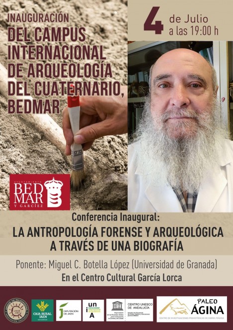 Acto inaugural y conferencia del IV Campus Internacional de Arqueología del Cuaternario, Bedmar 2022, que va a celebrarse hasta el 24 de Julio. La conferencia con el título “La antropología forense y arqueológica a través de una biografía” será realizada por el Dr. Miguel C. Botella López, profesor emérito en el departamento de Medicina Legal, Toxicológica y Antropología Física de la Facultad de Medicina de la Universidad de Granada, a las 19:00 horas en el Centro Cultural “García Lorca”.