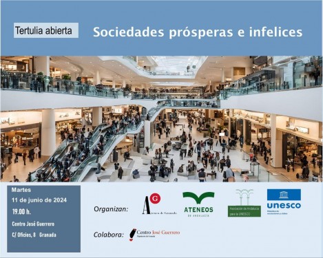 Continuamos con el ciclo de tertulias abiertas organizadas conjuntamente por la Asociación de Andalucía para la UNESCO y el Ateneo de Granada y con la colaboración del Centro de Arte José Guerrero. En esta ocasión con el tema "sociedades prósperas e insatisfechas".
