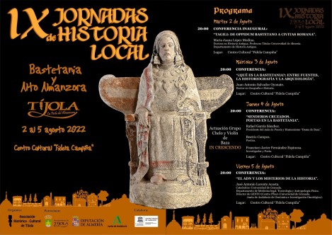 Durante la primera semana de agosto se celebrarán las IX Jornadas de Historia en Tíjola, organizadas por la Asociación Histórico-Cultural de Tíjola y patrocinadas por el Ayuntamiento de Tíjola y la Diputación de Almería, y con la colaboración del Centro UNESCO de Andalucía. El tema de esta edición es "Bastetania y el Alto Almanzora" y ha sido coordinada por Carmen Acosta.