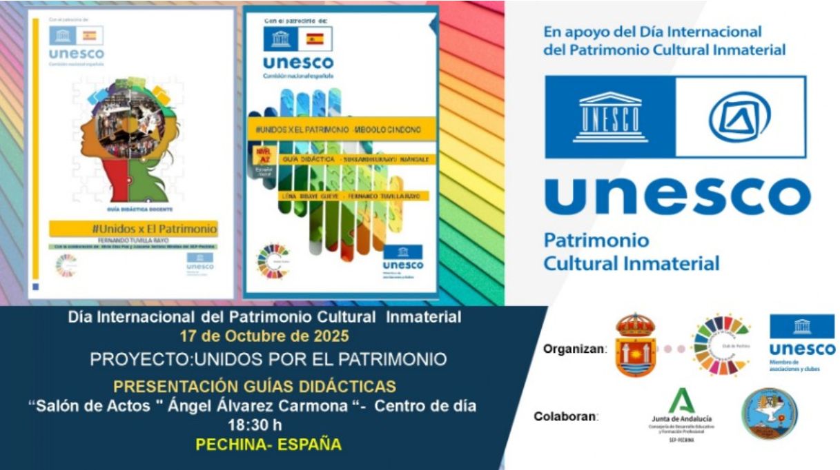 Con motivo del Día Internacional del Patrimonio Inmaterial, el Club de Pechina para la Educación, Ciencia y Cultura presenta las guías "Unidos por el Patrimonio". Estas guías se han elaborado en el marco del proyecto de alfabetización socioeducativa de la ciudad, y están desarrolladas por el curso de Alfabetización SEP-Pechina para inmigrantes senegaleses y personas apátridas (francés/wolof/Spanish). Realizadas por Fernando Tuvilla Rayo, proponen actividades especícas para promover el patrimonio cultural inmaterial, priorizando la participación, la creatividad y el aprendizaje