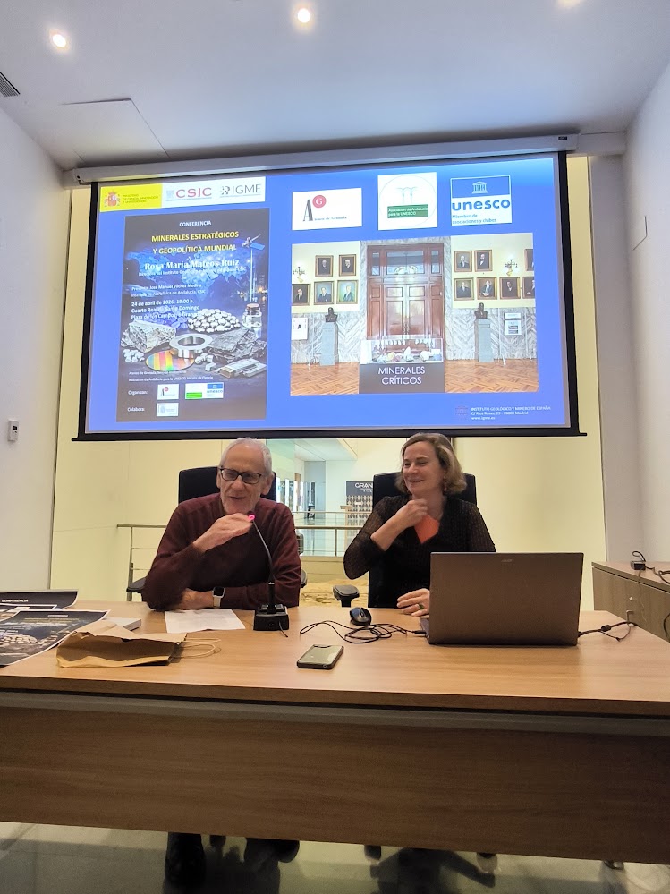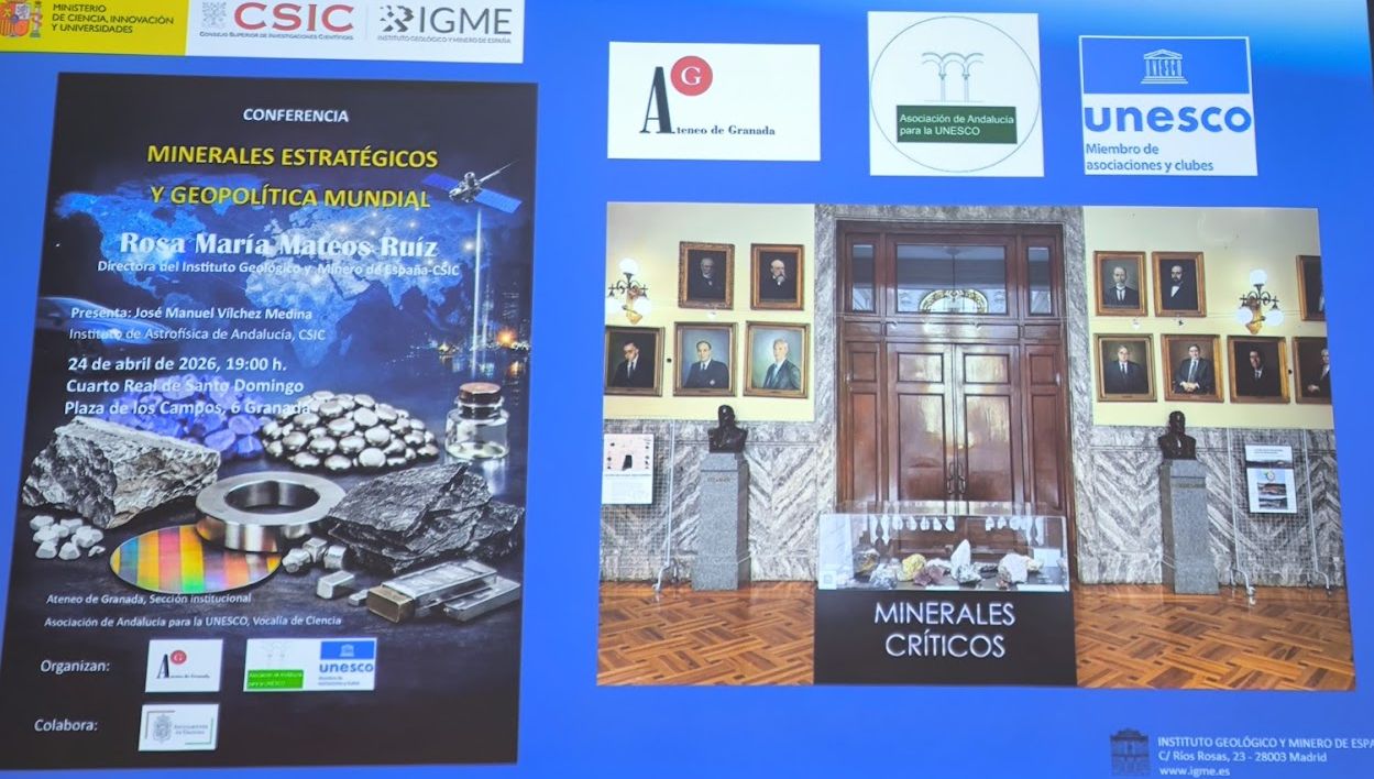 La conferencia “Minerales estratégicos y geopolítica mundial” impartida por Rosa María Mateos, directora del IGME-CSIC celebrada el 24 de abril en el Cuarto Real de Santo Domingo de Granada y organizada por la Asociación de Andalucía para la UNESCO y el Ateneo de Granada, abordó el papel clave de recursos como el litio, el cobalto o las tierras raras en el actual contexto internacional. La actividad permitió reflexionar sobre cómo el control y acceso a estos minerales se ha convertido en un eje central de la geopolítica contemporánea, así como sobre los desafíos ambientales, tecnológicos y estratégicos asociados a su explotación.